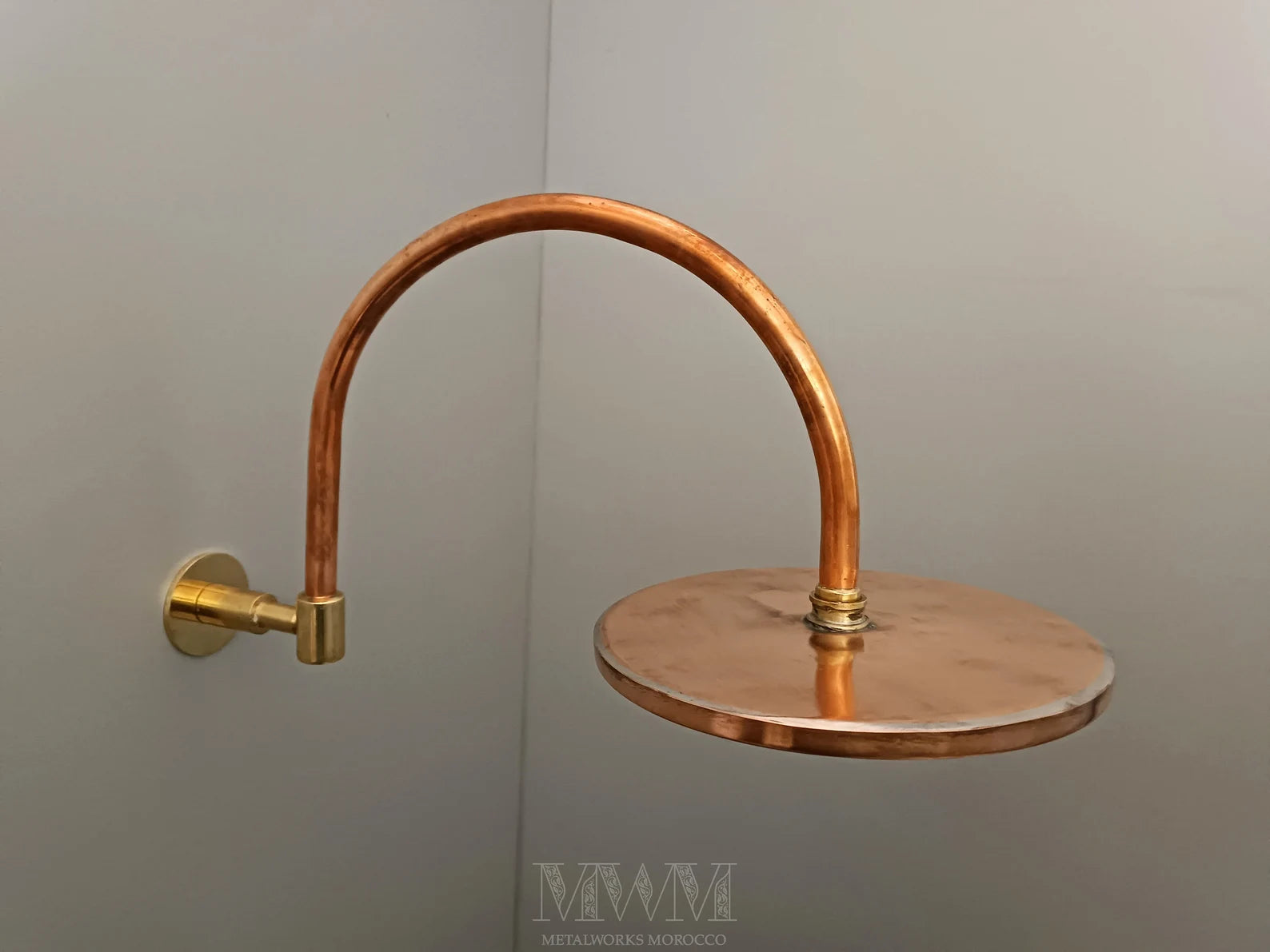 Made from solid copper, the shower arm features a graceful curved gooseneck design that extends elegantly from the wall, creating a classic rainfall effect. The matching copper shower head is carefully hand-finished, showcasing natural variations and rich tones that develop a beautiful patina over time.