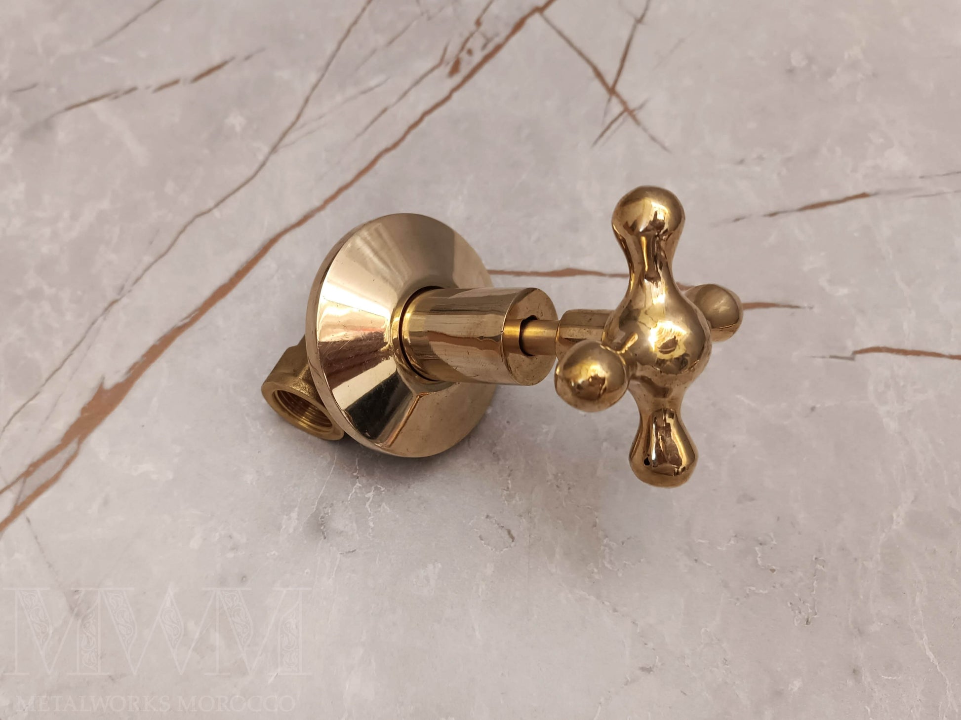 This is a handmade, brass gate valve with a 1/2-inch connection. It exhibits a classic, vintage design with a distinctive cross-shaped handle and a polished brass finish.